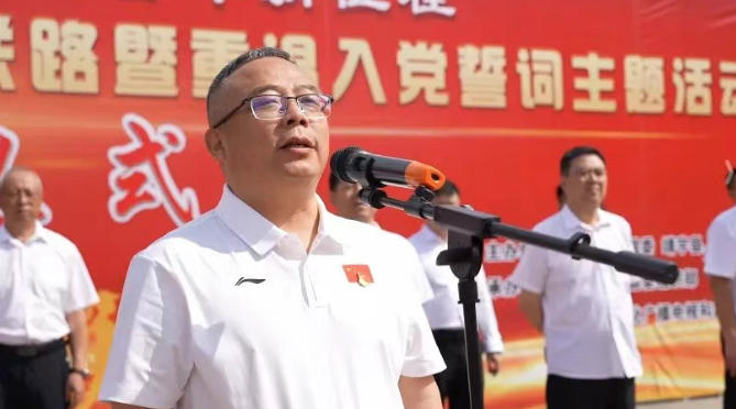 楊靖宇嫡孫馬繼民向全市優秀共產黨員代表授旗。