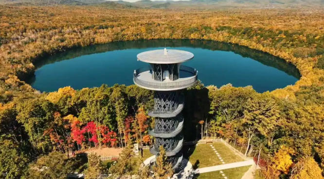 作為典型的火山噴發(fā)形成低平火山口湖,四海龍灣瑪珥湖擁有獨特的地質(zhì)與生態(tài)價值——湖面直徑達750米,近乎正圓,海拔791米,水位四季穩(wěn)定、水質(zhì)清澈如鏡;湖底沉積紋泥被譽為“開啟地球迷宮的金鑰匙”,記錄近10萬年古氣候變遷;景區(qū)森林覆蓋率超90%,秋日里紅楓、白樺與湖水相映,宛如天然油畫。新建成的3公里環(huán)湖木棧道蜿蜒其間,游客可沉浸式感受“原生態(tài)保護+輕量化開發(fā)”模式帶來的獨特體驗,這種開發(fā)方式最大限度保留了火山地貌的完整性,實現(xiàn)生態(tài)保護與旅游開發(fā)的和諧統(tǒng)一。